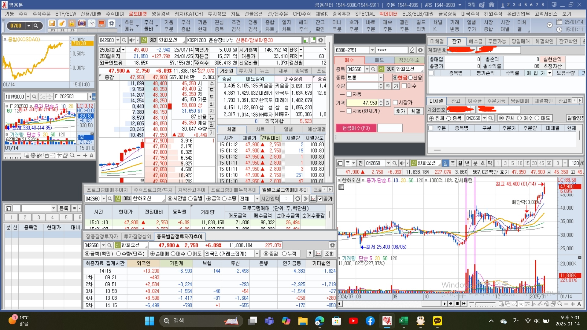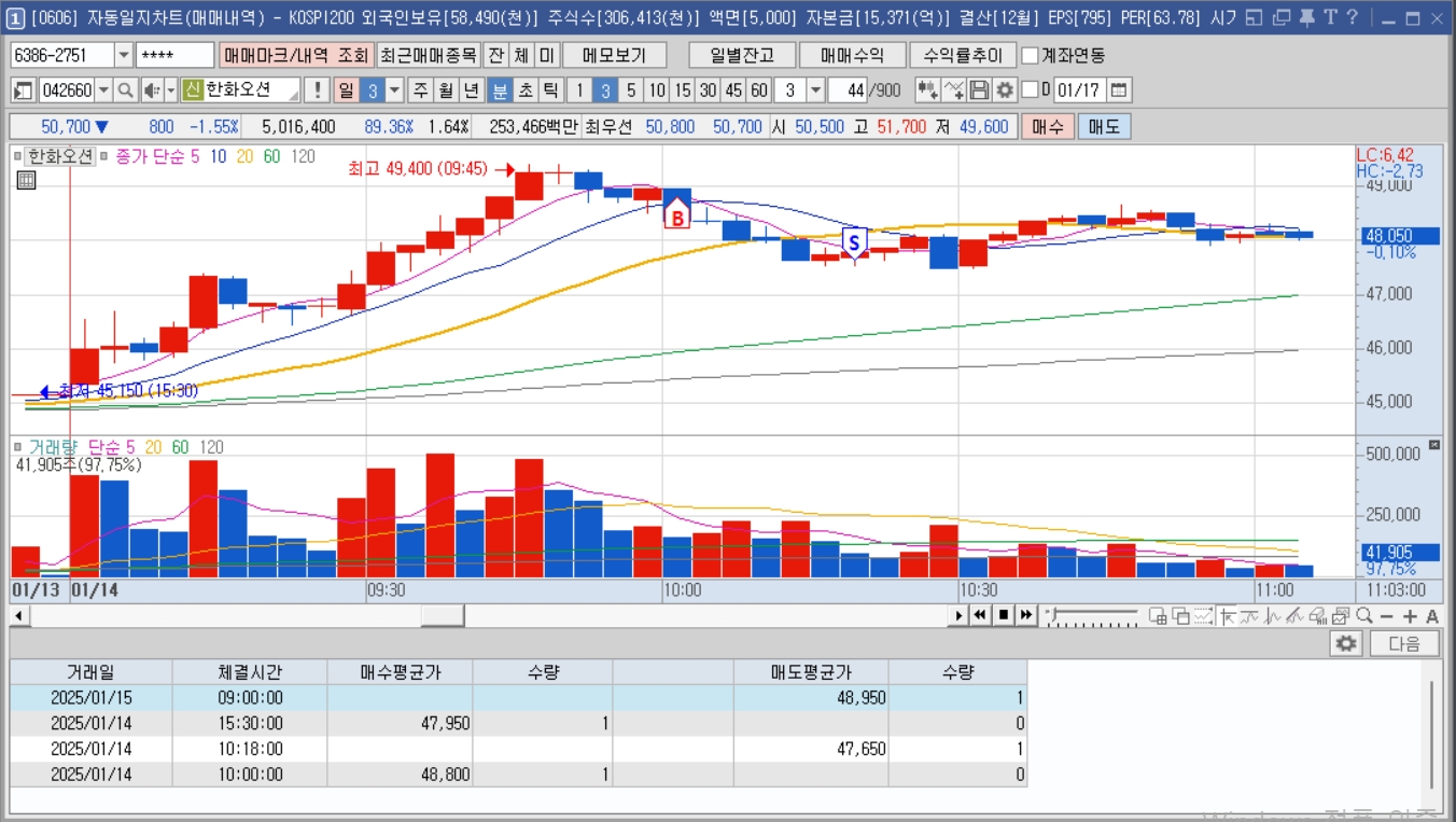 오전장에서는 거래를 관망하고 투자를 하지 못했다. 오후 3시경 장이 끝나갈 때쯤 대장주인 '한화오션'을 봤을 때 외국인에 매수세도 좋아 보였고,