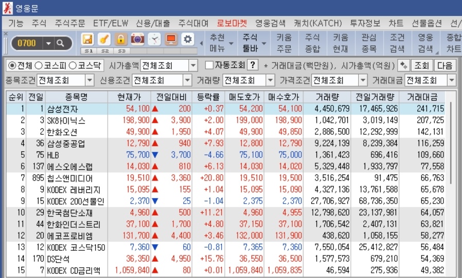오늘 아침 9시~9시 30분 오전장에 거래대금 상위 15위를 추리고, 주도 테마주와 대장주를 선택했다.