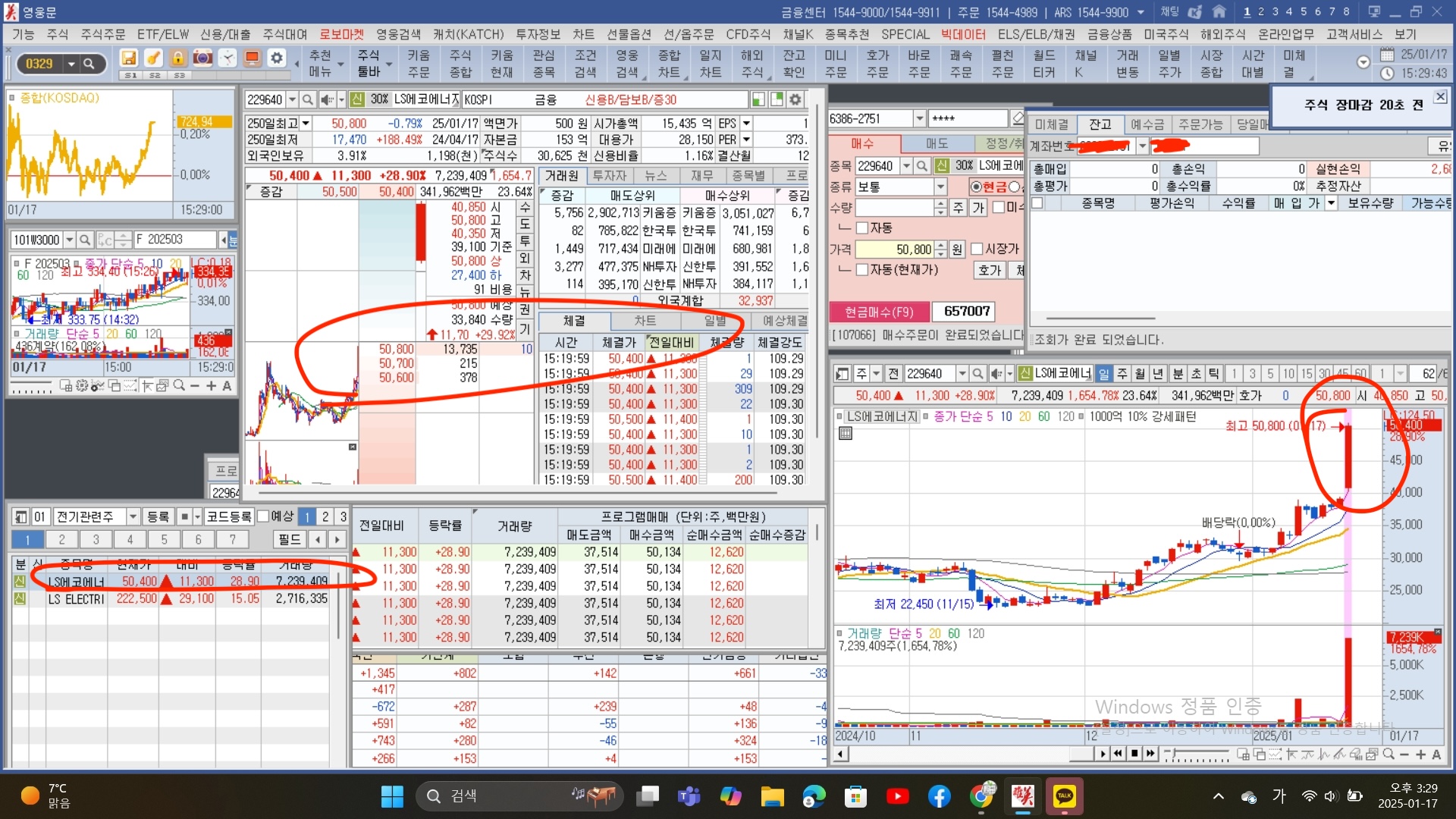다음날인 01/17 LA산불로 인해 전기관련주 등이 상승이 많이 오르고 있었던 것 같다.