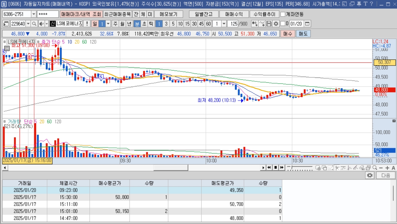 현재 날짜 01/20 오버나잇한 LS에코에너지가 장 초반에 내려가더니 오를 기세를 가지고 있어 보이지 않았다. 5만 원 지지선이 깨질 때 빠르게 빠졌어야 하는데 한번치고 올라가지 않을까라는 마음으로 기다렸다가 더 많은 솔질을 가져갔다.