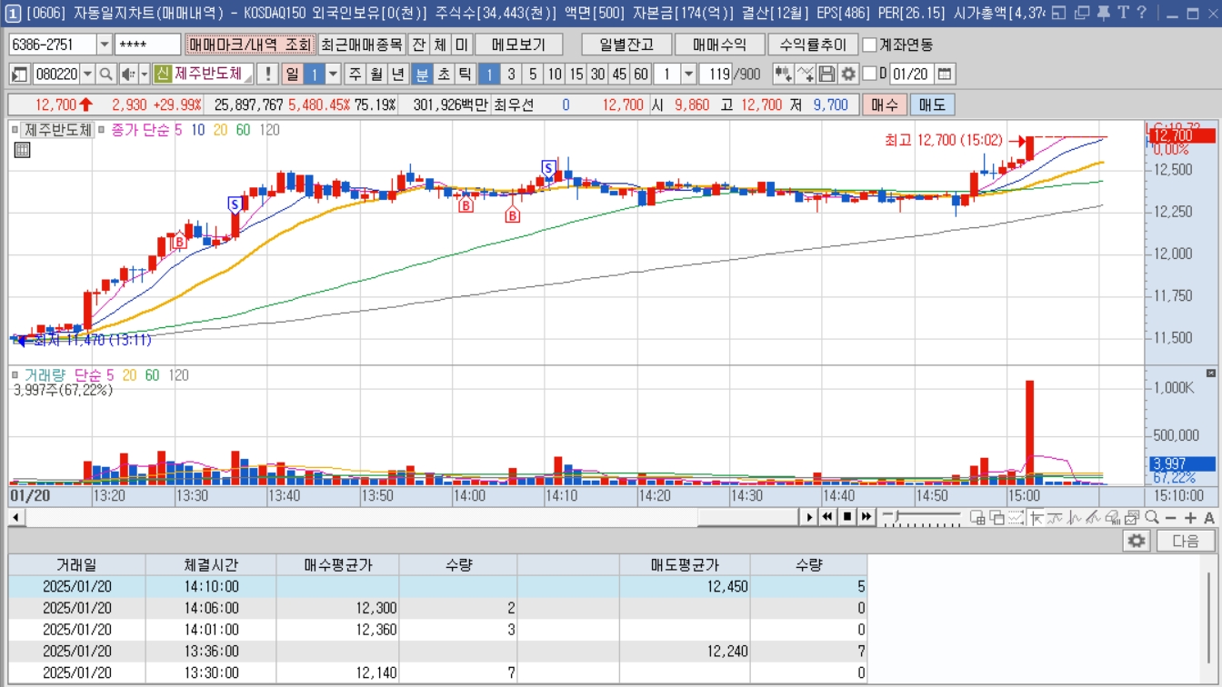 일을 다녀오고 오후장을 확인해 볼 때 제주반도체가 급격히 상승하며 거래대금 10위권 안에 들었다. 13시 30분쯤 거래량이 활발한 걸 느껴서 매수를 진행하고 한번 눌러주고 반등할 때 깔끔히 치고 빠졌다. 계속해서 장을 보고 있을 때 오늘 '제주반도체'가 30% 상승으로 마감할 것처럼 느껴졌다. 그냥 느낌이었고 이유가 무엇인지 찾지를 않았다. 이건 반성해야 할 거 같다.