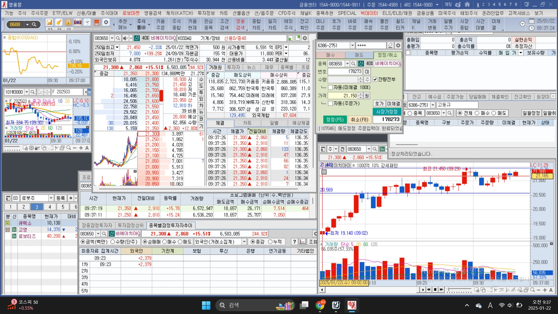 9시 25분쯤 망치형 음봉이 나오면서 양봉으로 전세가 역전되었다고 판단했고 급격한 상승이 올 거라는 판단하에 빠르게 매수하고 오를 때 빠르게 팔았다. 여기서 실수한 것은 시장가로 선택한 후에 팔아버려서 큰 수익이 나지는 않았다. 이후에 다시 음봉이 나왔고 또다시 양봉으로 번환 될 때 빠르게 매수하고 다시 팔았다.