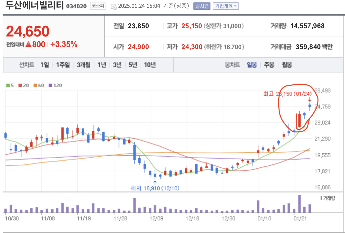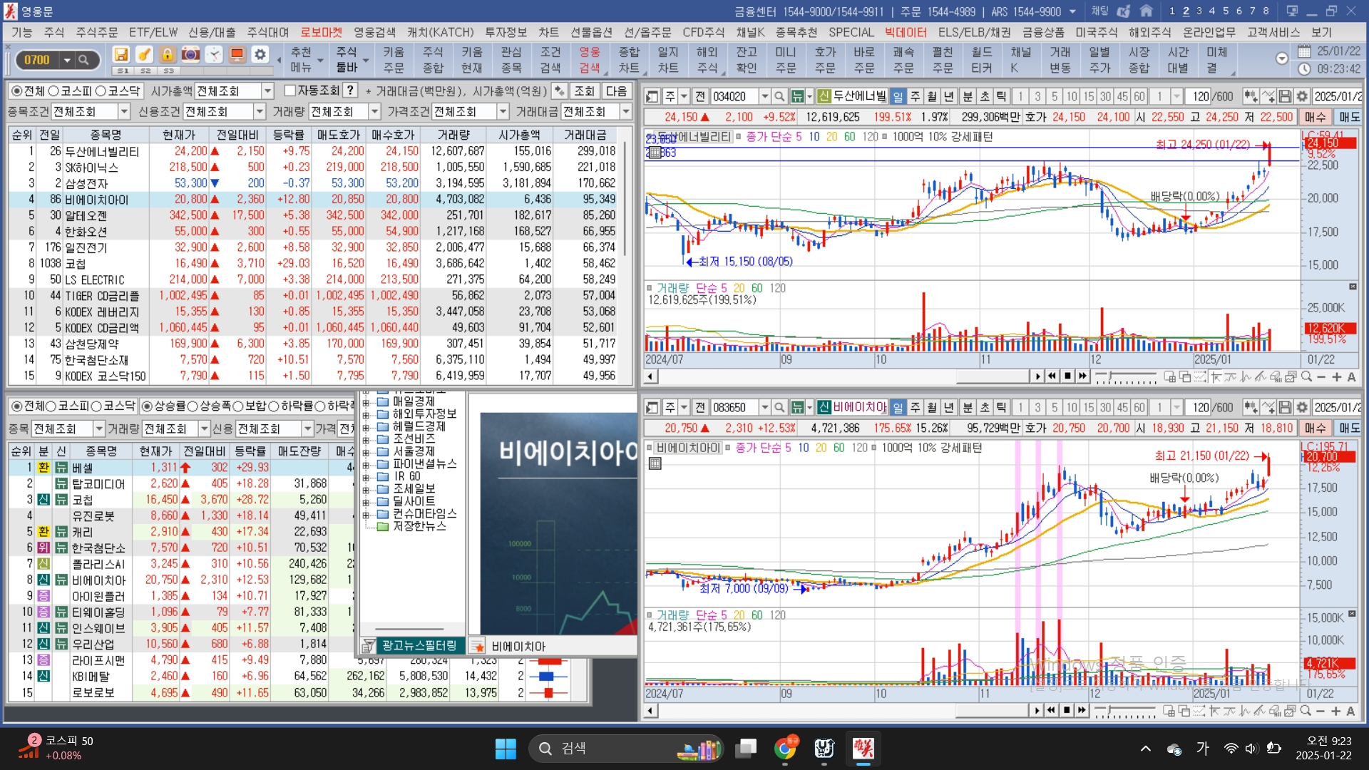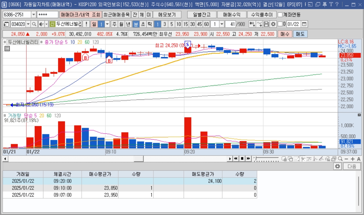 오늘도 어김없이 일어나자마자 거래대금을 돌려보면서 테마와 대장주를 찾았다. 눈에 보이는 주도 테마 원자력 쪽에서 '두산에너빌리티'와 '비에이치아이'가 눈에 들어왔다. 장 초반 '두산에너빌리티'가 대장주로 판단이 되어서 오전장 단타를 시작했다.