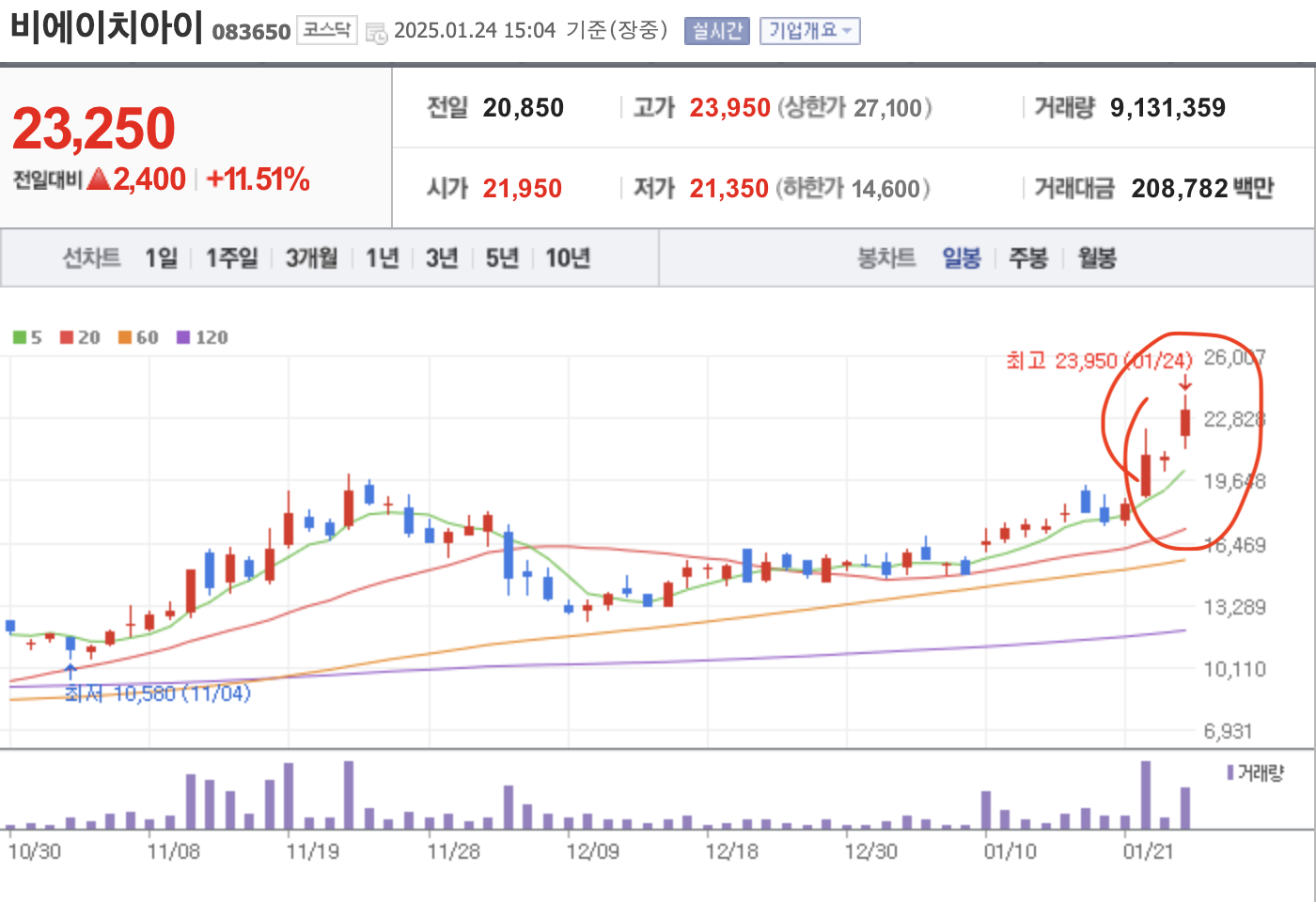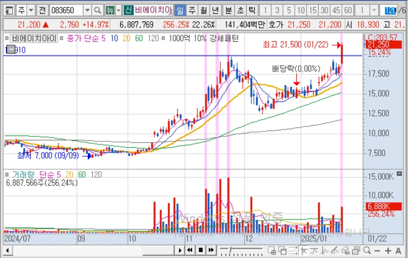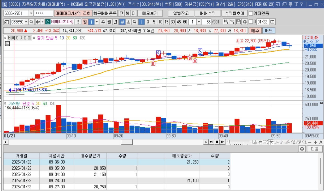 이후에 대장주가 두산에너빌리티에서 비에이치아이로 바뀐 것으로 판단되어 단타종목을 바꾸게되었다.