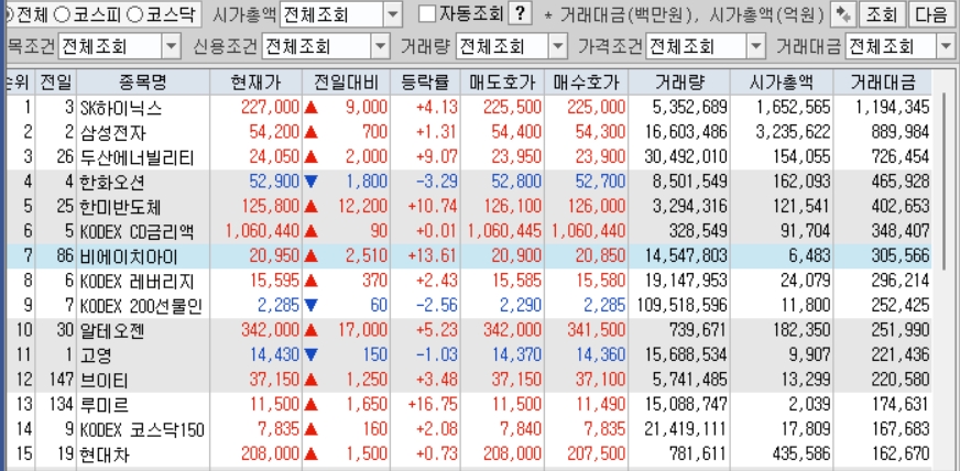 그래서 오전장에는 두산에너빌리티로 단타를 했지만 중간에 비에이치아이로 대장주가 바뀌는 느낌이 들어서 그 다음 비에이치아이로 단타로 수익을 약간 보았다.