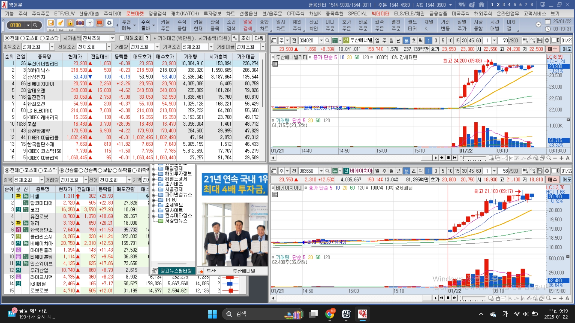 오늘도 어김없이 일어나자마자 거래대금을 돌려보면서 테마와 대장주를 찾았다. 눈에 보이는 주도 테마 원자력 쪽에서 '두산에너빌리티'와 '비에이치아이'가 눈에 들어왔다. 장 초반 '두산에너빌리티'가 대장주로 판단이 되어서 오전장 단타를 시작했다.