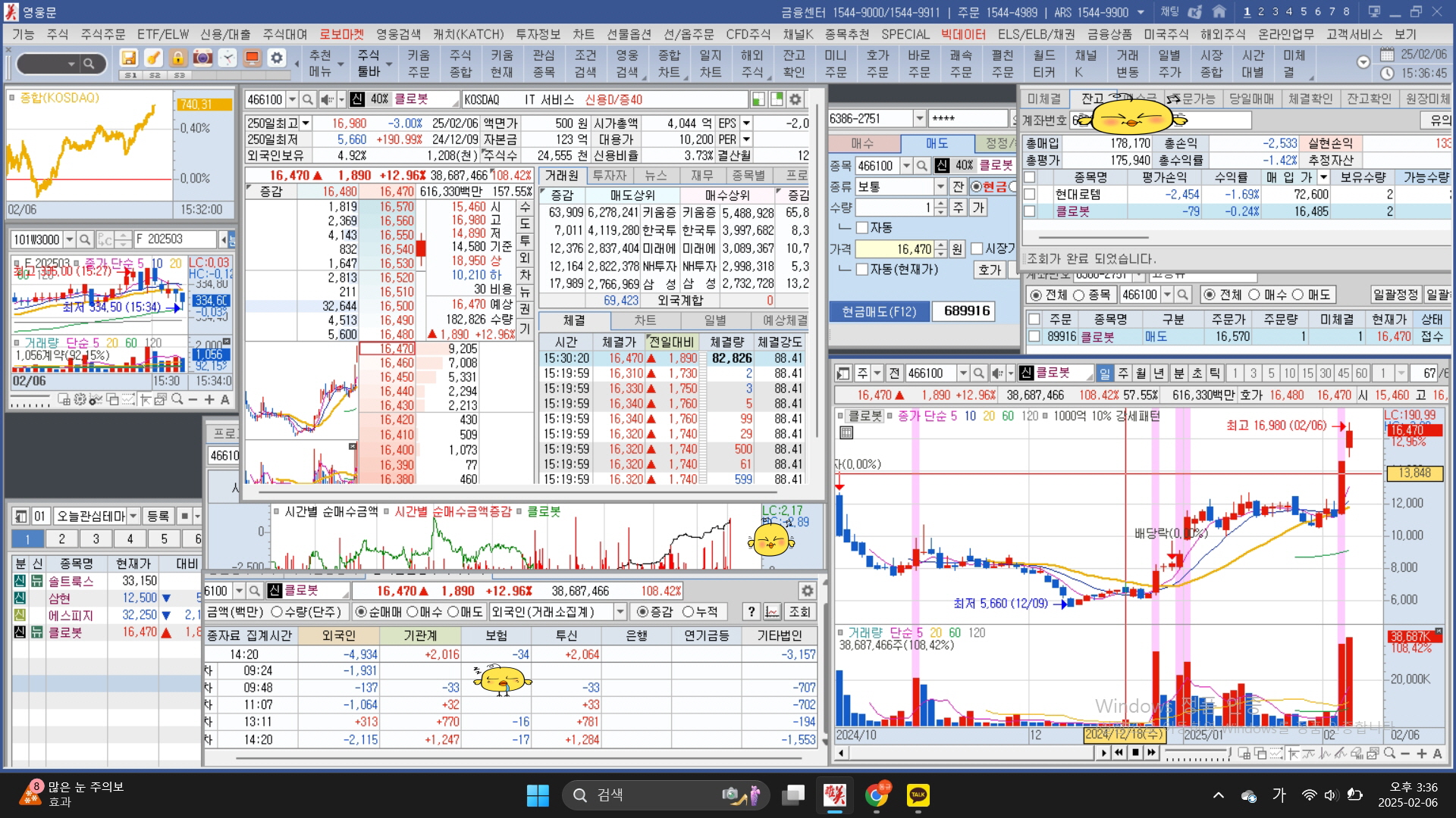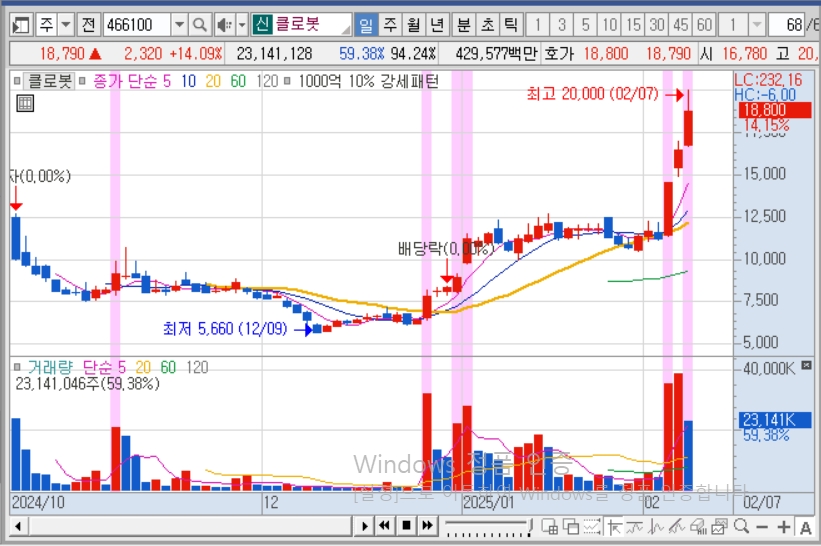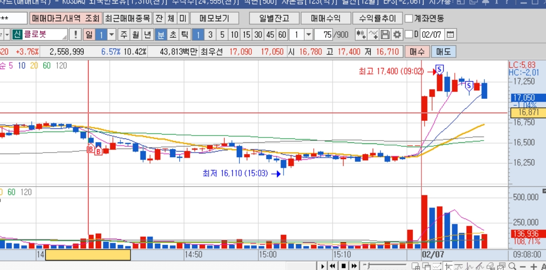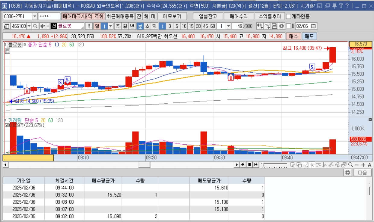 이날 주도 테마는 전날과 같이 ai 로봇관련주가 주도 테마로 이루어졌다고 생각했다. 전날 최고가 갱신하고 뉴스 좋은 소식으로 인해 클로봇이 대장주라고 생각했다. 그래서 오전장에 단타를 했다.