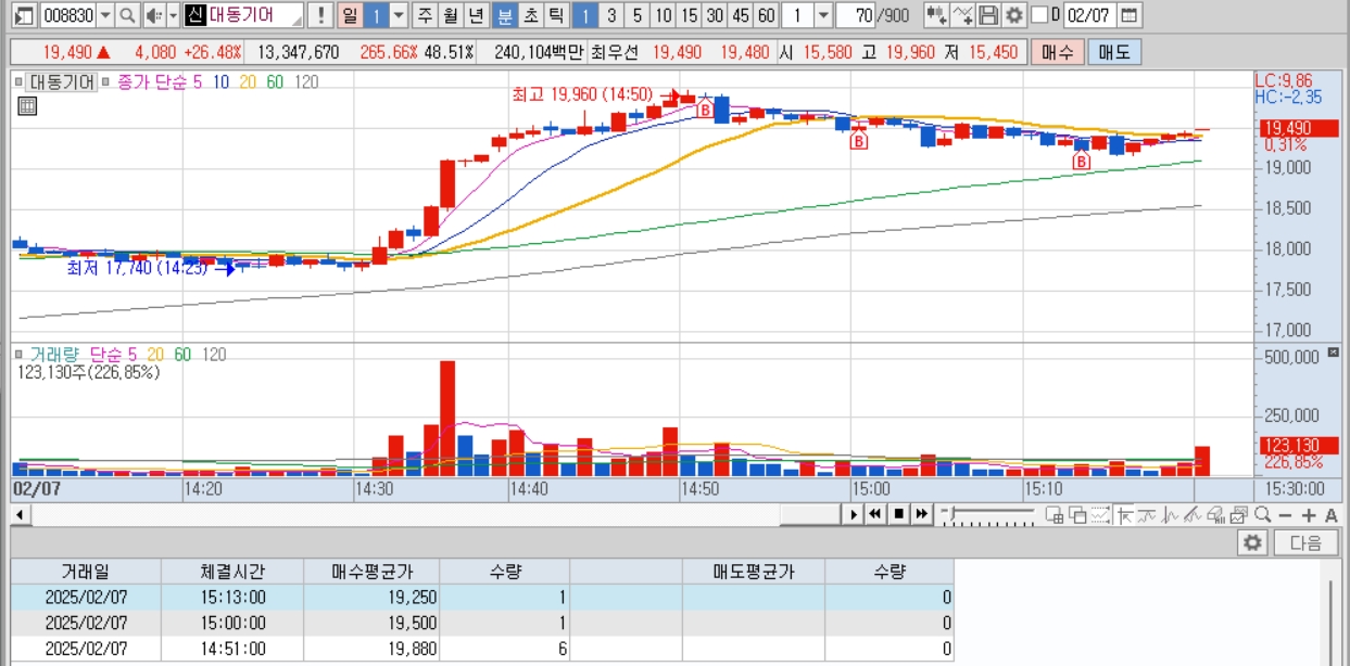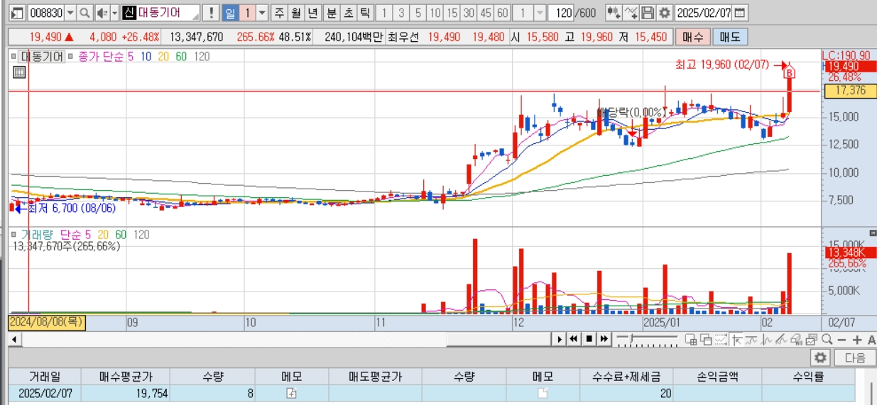 눈에 들어온 것은 대동기어이다. 대동기어도 우크라이나 관련주로서 전진건설로봇 대장주에 이은 2등주로 볼 수 있었다. 대장주가 30% 오른 상태이기 때문에 대동기어로 매수세가 쏠리지 않을까 생각을 했다. 그래서 장이 끝나기 30분 전 과감히 단타를 하기 위해 매수에 들어갔다.