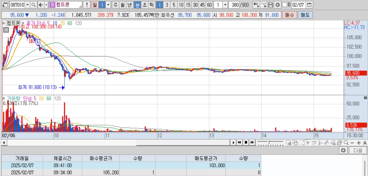 오전장에는 유리기판 테마가 강세를 보이는 것 같았다. 이번주는 대체적으로 로봇, ai 등 여러 테마가 강세를 보이며 국장이 좋은 모습을 가져오는 걸 알 수 있어서 테마 고르기가 상당히 힘들었던 것 같다. 현재는 유리기판이 강세를 보이는 것 같아서 그중 대장주인 펩트론이 강세를 보이는 것 같았다. 그래서 눌림을 기다리고 단타를 시도했다.