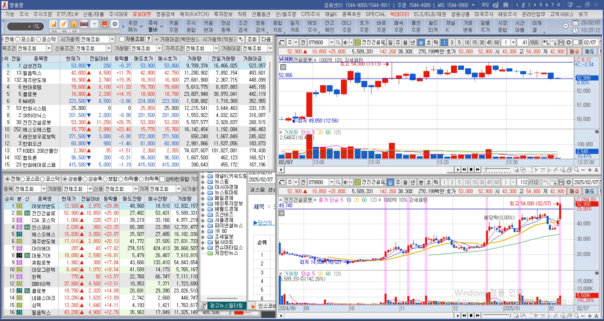 오후장에는 노트북을 켜보니 우크라이나 전쟁관련 테마가 강세를 이어갔다. 뉴스를 흙어보니 트럼프가 다음 주 전쟁종결시킨다는 이런저런 기사가 나오면서 여기에 관련된 주들이 상승을 이어가고 있었다. 그중 대장주로는 전진건설로봇이 있었다. 일봉으로 볼 때도 120일 기준 최고가 경신은 물론 끼도 있는 종목으로 판단되었다. 이렇게 국장 분위기도 좋은 장에서는 30% 상승하며 마감할 거 같았다. 그래서 적당할 때 들어가려고 보고 있었는데 이미 30% 상승하여 매수를 할 수 없게 되어버렸다. 아직 시간 외 매수매도하는 법을 몰라서 포기하고, 우크라이나 관련테마의 주식을 찾아보았다.