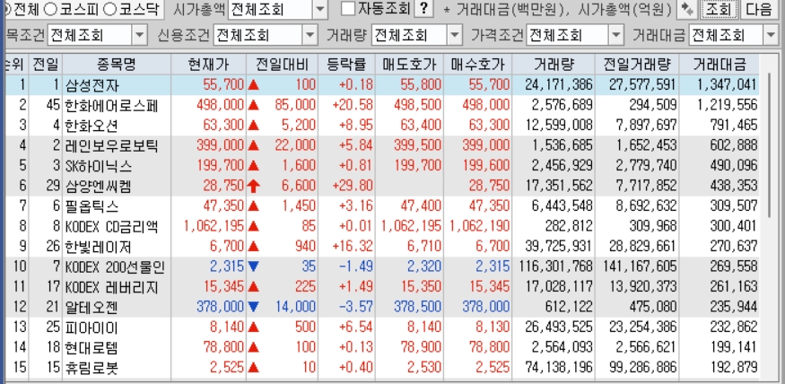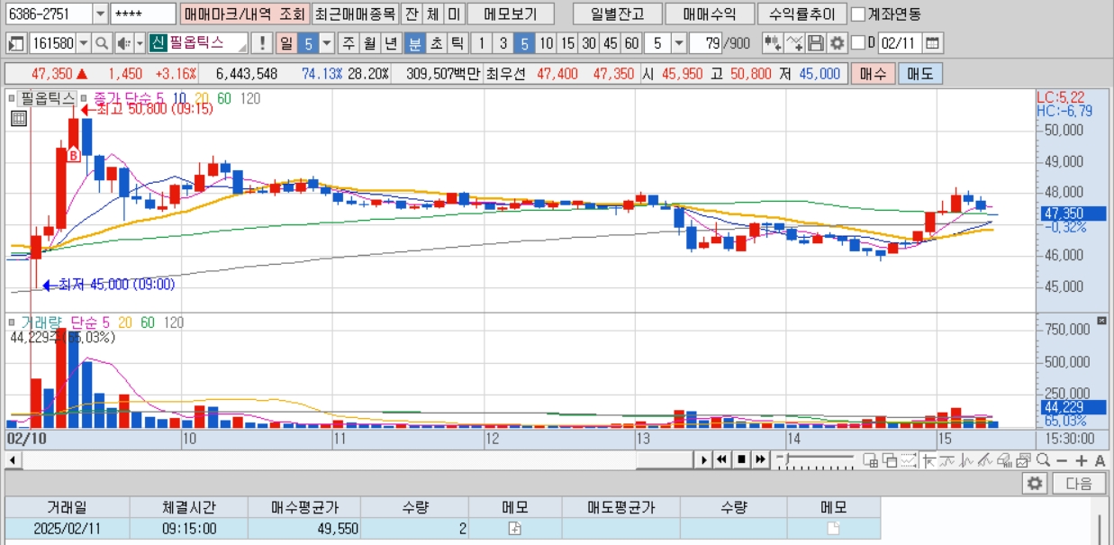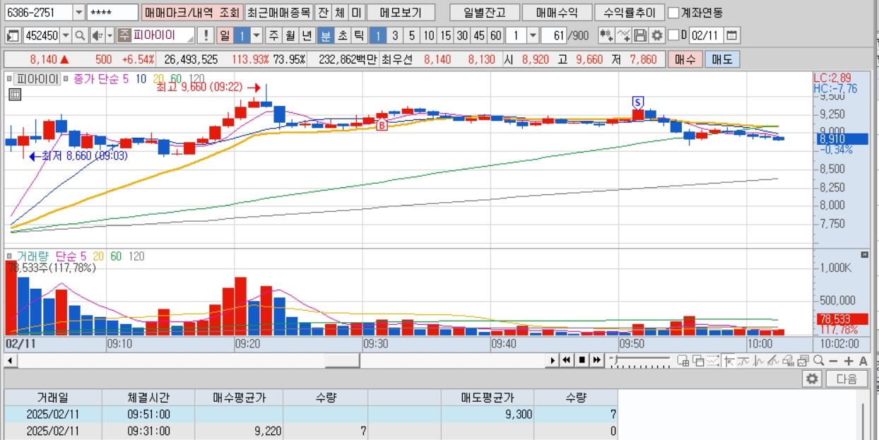 피아이이와 한빛레이저, 필옵티스 중 피아이이와 한빛이 초반 강세가 이어졌다. 우선 피아이이는 갭상승이 큰 상태였기에 조금 조심하려고 했는데 한빛레이저가 마치 레이저를 쏘듯이 급상승이 이어지며 오늘의 대장주로 자리 잡으려고 했던 것 같다.