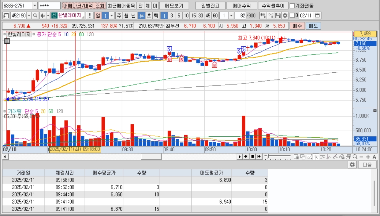 09시 23분경부터 눌림을 주고 반등하려고 할 때 매수를 하여 단타를 시도했다. 원래의 나였다면 2분 후 상승이 뜰 때 매도하여 조금 수익을 챙기겠지만, 항상 손실이 크고 수익이 적다는 단점을 보강하기 위해 매도 타점을 조금 높게 잡았다. 그러나 횡보가 길어지자 참지 못하고 09시 50분 상승을 크게 줄 때 매도하여 빠져나왔다.