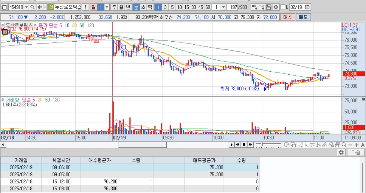 어제 로봇테마에서 대장주인 유일로보틱스가 30% 상승 후 마감하여 종가배팅을 하지 못해서 2등 주인 두산 로보틱스를 샀었다. 외국인과 기관도 잘 들어와서 좋다고 생각했지만, 우선 2 등주였고, 화끈한 뉴스도 없는 건 신경이 쓰였다. 그래서 오전에 장을 보고 좋지 않으면 바로 매도하려고 했다.