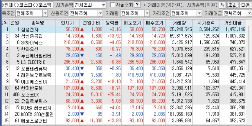 2시30분이 넘을 때 노트북을 켜고 거래대금을 확인을 해봤더니 삼성중공업이 엄청난 거래대금으로 2위를 기록하고 있었다. 하지만 투자원칙을 지켜야 하기에 공책에 테마와 대장주를 정리하며 지금 장을 이끄는 테마는 무엇일까 먼저 생각을 해보았다.