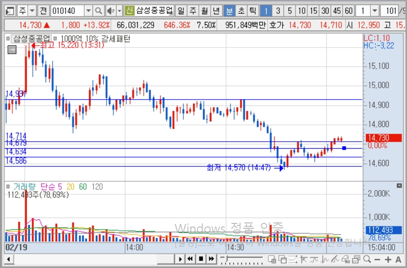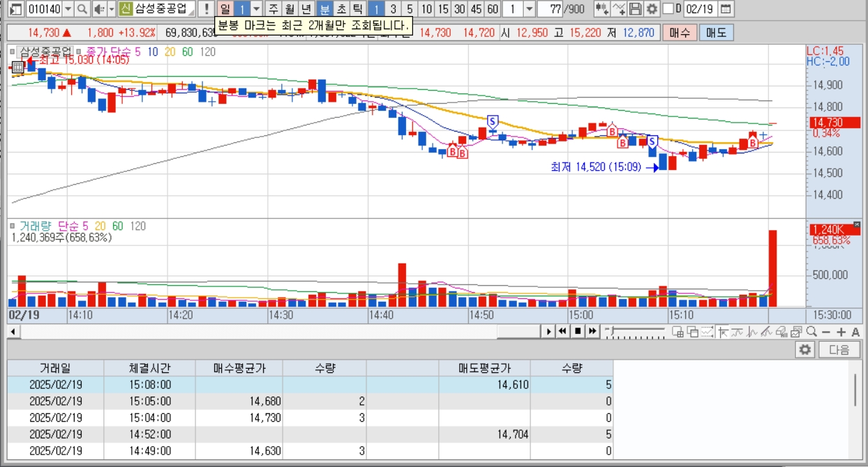 두 번째 단타를 할 때는 내가 너무 성급했던 매수였던 거 같다. 14,680원에 매수하여 눌림 하여 지지선 14,630원을 지지하지 못하면 기계적으로 매도하겠다고 생각하여 이후 반등이 나왔지만 매도세가 센 거 같아 빠르게 손절 치게 되어 두 번째는 실패를 하게 되었다.
