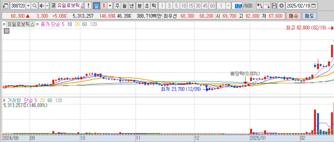 생각했던 대로 초반 장이 좋지 않아서 바로 매도하였고, 어제 대장주였고 120일선에서 장대양봉이 나오고 거래대금도 터진 유일로보틱스를 보았었다. 역시 대장주로서 기대감과 뉴스소식이 있었어서 그런지 갭상승으로 시작하며 초반 상승세를 이끌었다.