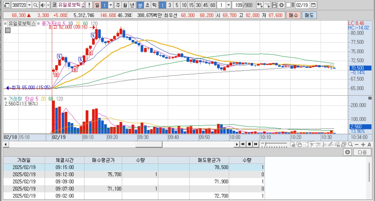 확실히 2 등주는 종가배팅 하는 것에 있어서 조심해야겠다고 느낀 후 유일로보틱스로 단타를 바로 시도했다.