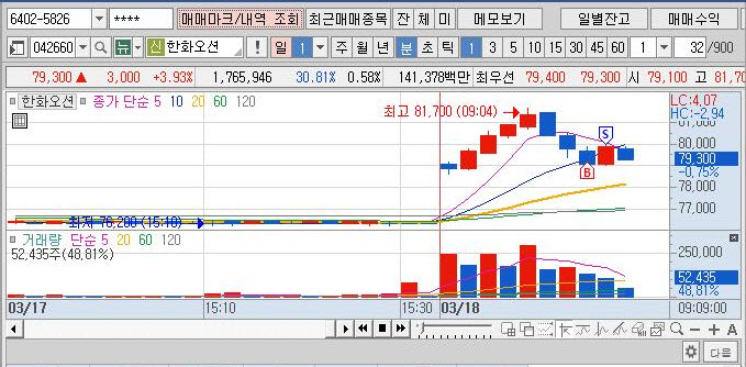 대장주 대결하고 있다고 생각한 한화시스템과 한화오션 중에서 한화시스템은 이미 너무 빠른 양봉이 발생하며 타이밍을 놓치게 되었다. 근데 한화오션이 한화시스템을 따라가고 있는 게 눈에 보여서 상승하지 않고 있던 한화오션을 빠르게 매수를 했다.