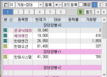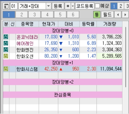 우선 어제 거래대금이 터지고 5% 이상 유지했던 종목들을 정리해 보자면 한화시스템은 전날 장대양봉이 터져서 2일 차로 오늘이 마지막 정리하는 날로 보면 될 거 같고, 오늘 온코닉테라퓨틱스는 30% 상승하며 마감하고, 에어레인, 한화엔진, 한화오션이 좋은 상승을 보여주며 마감한 것으로 보인다.