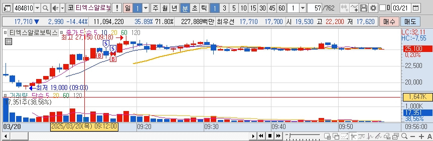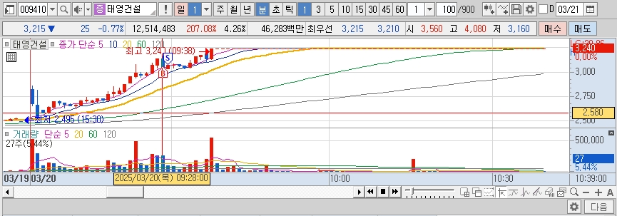 그래서 태영건설우를 따라 태양건설도 거래가 원활히 이어지는걸 확인해서 바로 매수에 들어갔다. 9시 28분에 음봉이 길게 나올 때 매수에 들어갔고 9시 29분 양봉으로 전환되어 빠르게 매도를 해서 빠져나왔다. 하지만 역시 태영건설도 태양건설우를 따로 30% 상승하여 장을 빠르게 마감한 것을 볼 수 있다.