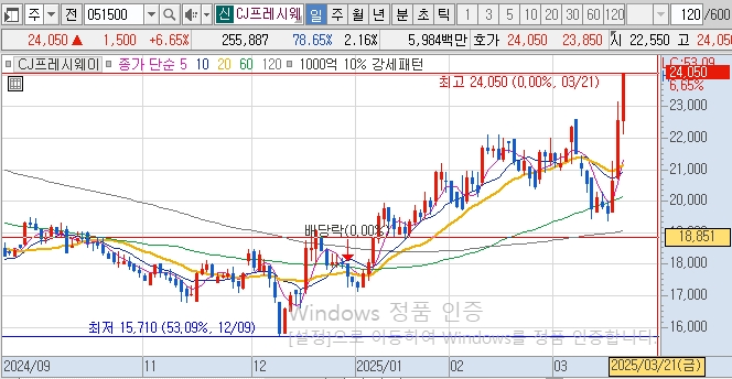 20일 목요일 오전장 시작 전에 뉴스 관련된 글을 써봤다. CJ가 올리브영 합병으로 인해 기대감으로 목표가가 상향되었다는 뉴스가대 부분이었다. 그래서 CJ관련주를 관심종목에 넣어두었는데 CJ프레시웨이라는 종목을 잘못 관심종목에 두었다.