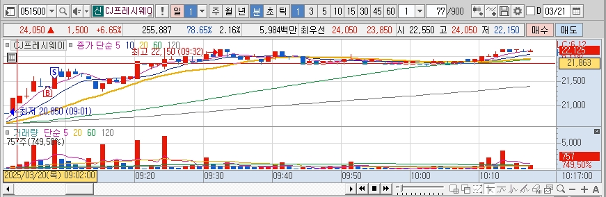 20일 목요일 오전장 시작 전에 뉴스 관련된 글을 써봤다.  CJ가 올리브영 합병으로 인해 기대감으로 목표가가 상향되었다는 뉴스가대 부분이었다. 그래서 CJ관련주를 관심종목에 넣어두었는데 CJ프레시웨이라는 종목을 잘못 관심종목에 두었다.