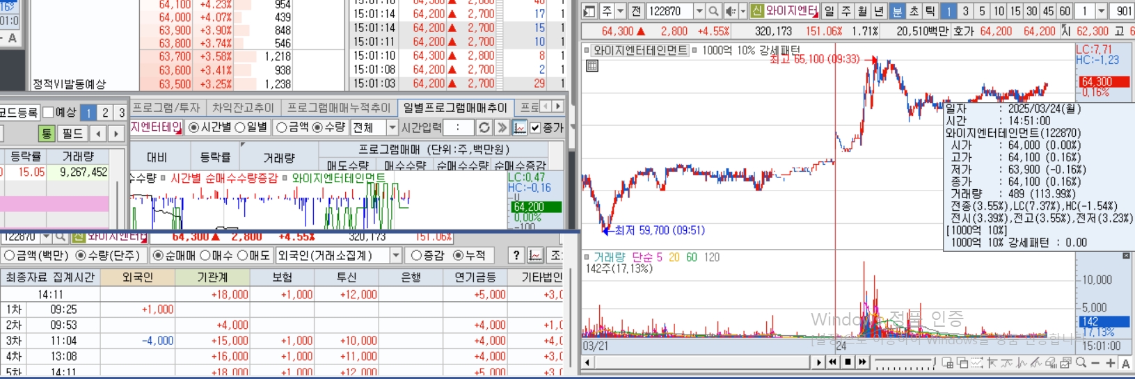 오늘 와이지엔터테인먼트를 보면 기관도 잘 들어오고 장이 나쁘지 않았다.