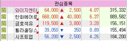 현재 시간 14시56분 기준으로 관심종목에 담아두고 보았다. 뉴스를 볼 때 와이지엔터테인먼트가 제일 눈에 들어왔고, 금호석유도 기대가 좀 되었다. 한화에어로스페이스는 이렇게 상승할지는 몰랐다.