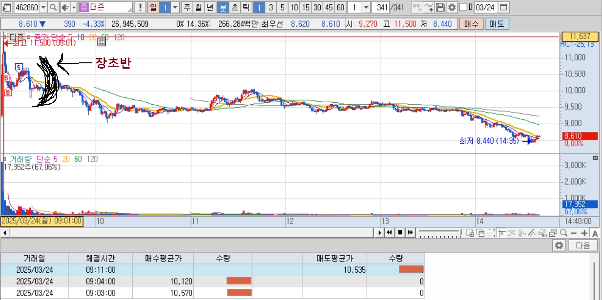 더즌 같은 경우에는 신규주로서 상승을 주지 않을까라는 생각으로 장이 빠질 때 매수에 들어갔다. 전체적으로 보면 아주 잘못되고 위험한 투자였어서 앞으로는 하지 말아야 할 거 같다. 9시 3분쯤 충분히 빠졌다고 생각할 때 매수를 했고, 근데도 이후에 계속 빠지는 걸 보고 물타기를 했다. 솔직히 급하강 후엔 잠깐이라도 급상승이 올 거라는 나만의 판단이었다.