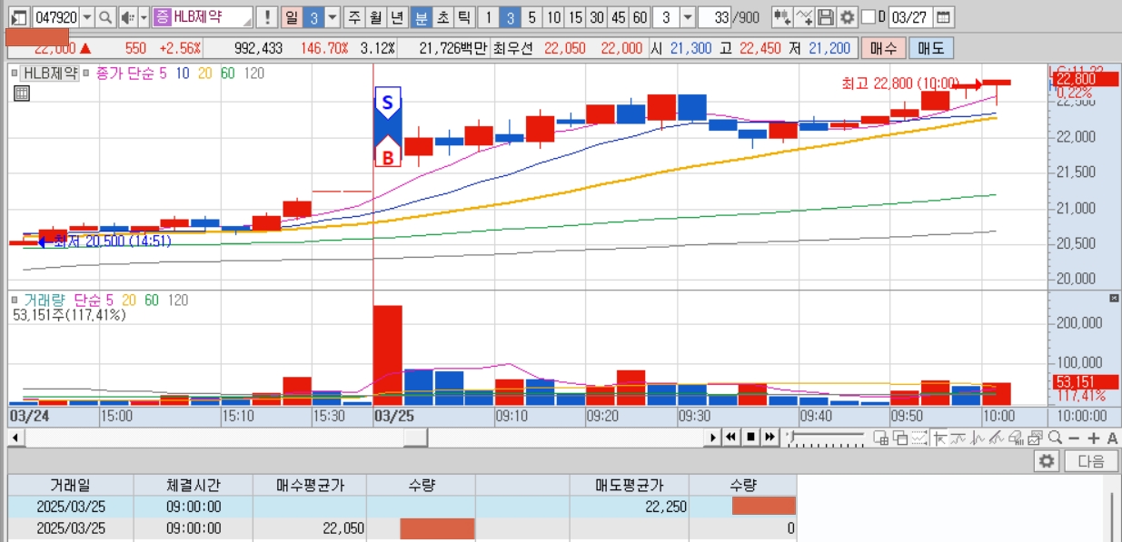 오늘은 어제 흐름이 좋았던 관심종목에 있던 HLB제약으로 단타를 했다. 9시에 시작해서 9시에 끝낸 1분도 안되는 단타였다. 어제의 흐름을 이어 갭상승으로 시작을 했는데 시작하자마자 갭을 메우려는 모습을 보였다. 하지만 여러 번 이런 상황을 볼 때 쉽게 갭을 메우지 않을 거 같다고 판단한 게 어제 수급이 너무 좋았기 때문에 상승으로 갈 거 같다고 판단했고, 하락이 빠르게 내려오니 기회라고 판단하여 매수했다. 하지만 장 초반 거센 파동으로 위아래로 왔다갔다하길래 살짝 오를 때 빨리 팔아버렸다. 그래서 0.76% 수익을 보았다.