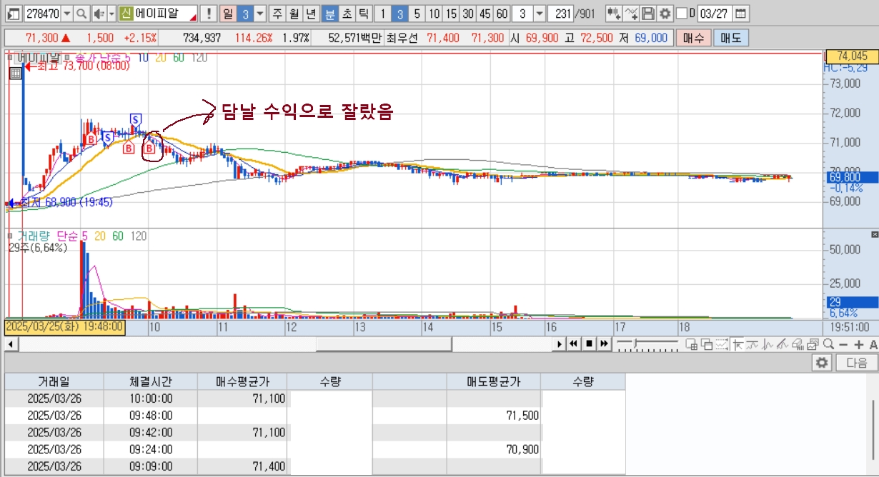 오늘은 03월 26일 처음으로 단타의 쓴 맛을 봐서 심리 조절이 안되는 거 같다. 개인 사업을 하면서 뭔가가 내 머릿속에서 건드리는 느낌을 받아서 투자가 이상한 길로 가는 거 같다. 오늘은 총손실이 -0.18% 밖에 안 된다. 거의 손실 난것도 아니지만 심리가 흔들려서 자제하고 있다. 오늘 나의 가장 큰 문제점인 큰 손실 잘라내기가 되지 않았다. 글을 쓰면서 마지막에 문제점에 대해서 써야겠다.