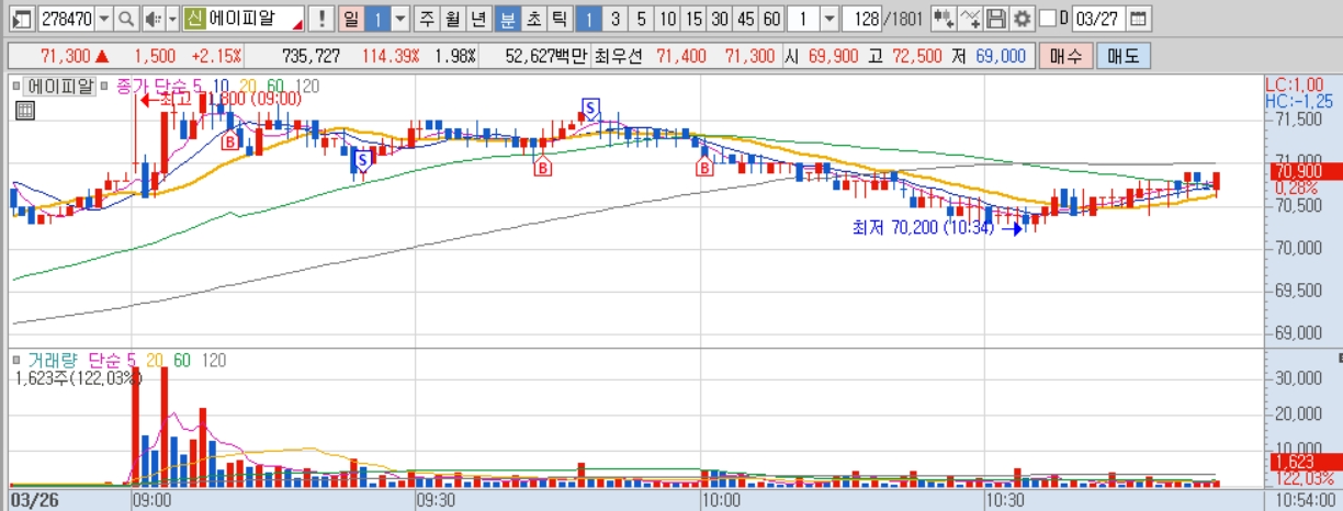 내가 에이피알을 선택한 이유로는 1분기 매출액과 영업이익이 전년 동기 대비 증가한 수치를 기록하며 목표주가를 기존 7만원에서 9만 원으로 상향 조정했다. 오전에 외국인 수급도 지켜보았는데 JP모건에서 매수가 들어오며 외국인 수급에서도 꽤 좋은 모습을 보여주었다. 또 120일선 기준으로 최고점을 찍고 있었기에 충분히 투자할만한 가치가 있다고 느꼈다.