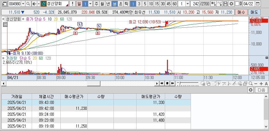 차트를 보면 성신양회우가 이미 30%상승 마감하여 성신양회는 따라가는 그림이 보였기에 마음 편히 매수를 할 수 있었던 거 같다. 하지만 성신양회우가 갑자기 빠지는지도 체크하며 매수를 했어야 했다.